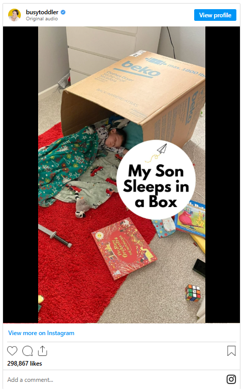 In addition to being a mom, Allison has a master’s degree in early childhood education — and a huge social media following as activity guru “@BusyToddler.” She has shared the box/bed story through the years and followers have been riveted. Matt’s box has been such a sought-after topic that it has its own Instagram highlight titled, of course, “Matt’s Box.”