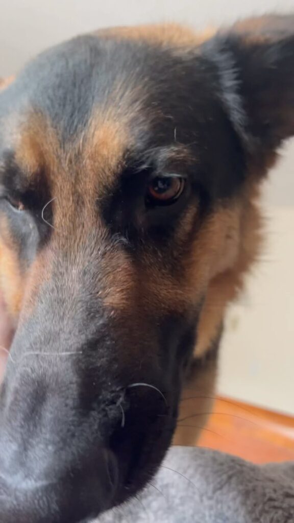 Zeus, the proud German Shepherd, stood near the couch, ears high, eyes sharp, pretending to be the picture of calm obedience. But his tail was giving him away — a slow, annoyed flick back and forth like a warning flag before a storm.
