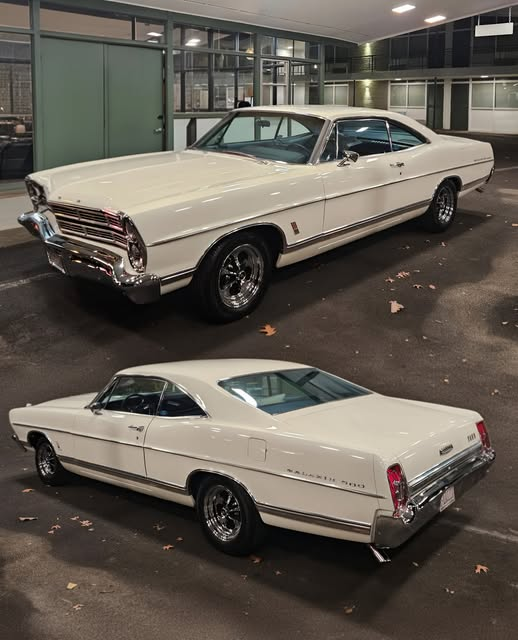 Sliding smooth through the parking lot, a 1967 Ford Galaxie 500 — Wimbledon White, flawless, timeless — glided in like a ghost from another era. The chrome bumpers shimmered under the lights, and the reflections danced across the smooth lines of the body.