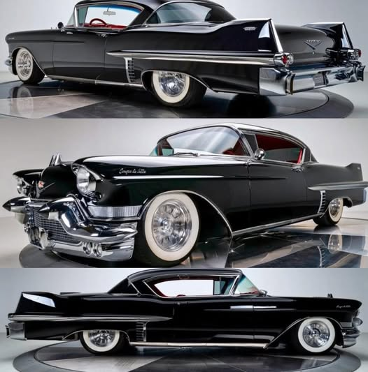 Johnny’s pride and joy sat under the flickering streetlight outside his garage: a black 1957 Cadillac Coupe DeVille, the kind of car that turned heads and stopped hearts. Its deep onyx paint gleamed like wet ink, its chrome trim sharp as a knife’s edge. Whitewall tires, red leather seats, and fins that looked like they could cut through the sky — it was the perfect blend of muscle and elegance.
