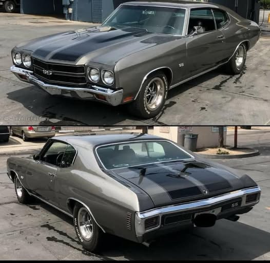The 1970 Chevrolet Chevelle SS sat under the dim light of the garage, its silver-gray body glimmering faintly, black stripes cutting across the hood like old scars that refused to heal. The air smelled faintly of oil and time, that strange scent of something alive yet silent.