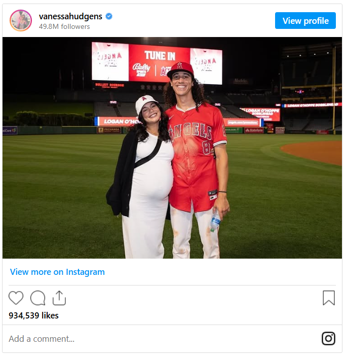 In the sweet snap, the “High School Musical” star donned a white dress that hugged her baby bump, pairing her look with a black cardigan and white Angels baseball cap.